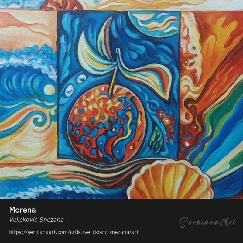 "Morena" is a symbolic painting that merges the elements of the sea, light, pearls, and the movement of life.