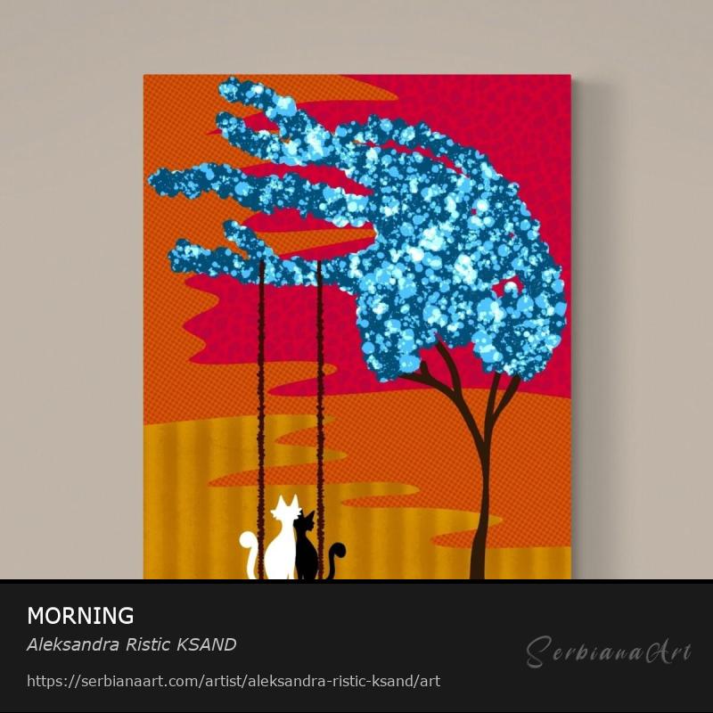 "Morning" captures the magic of a fresh, golden sunrise, featuring a black and a white cat playfully swinging under an extraordinary, surreal blue tree. The rich colors bring to life the crispness of a new day, with hues of golden-yellow-orange symbolizing hope, energy, and the promise of new beginnings.