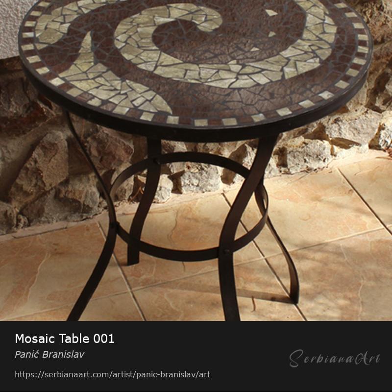 This mosaic table was made from ceramic tiles, glued with cement, frame and legs are metal.Share and promote this artwork