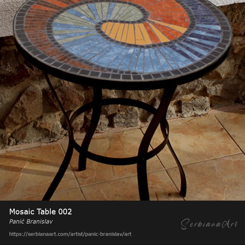 This mosaic table was made from ceramic tiles, glued with cement, frame and legs are metal.Share and promote this artwork