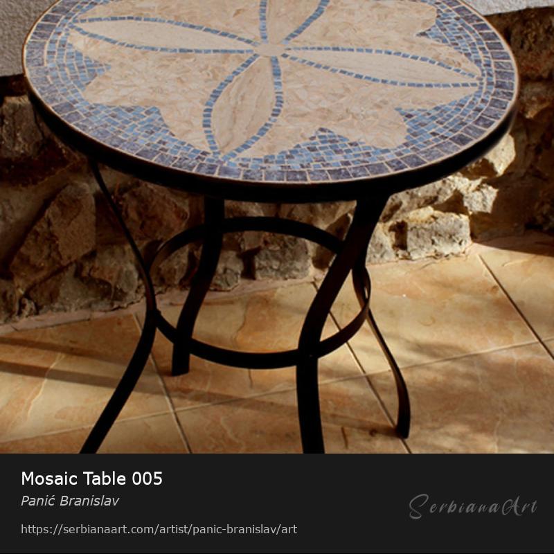 This mosaic table was made from ceramic tiles, glued with cement, frame and legs are metal.Share and promote this artwork