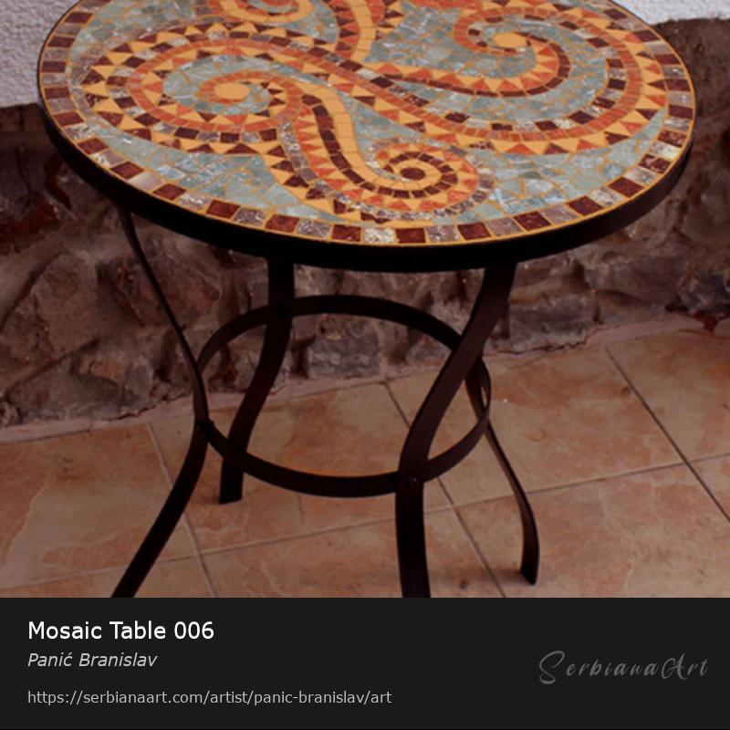 This mosaic table was made from ceramic tiles, glued with cement, frame and legs are metal.Share and promote this artwork
