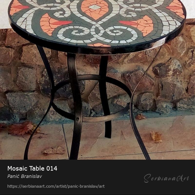 This mosaic table was made from ceramic tiles, glued with cement, frame and legs are metal.Share and promote this artwork