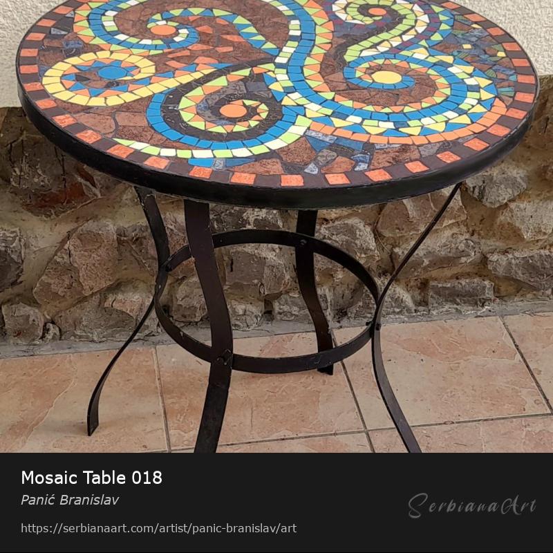 This mosaic table was made from ceramic tiles, glued with cement; frame and legs are from metal.