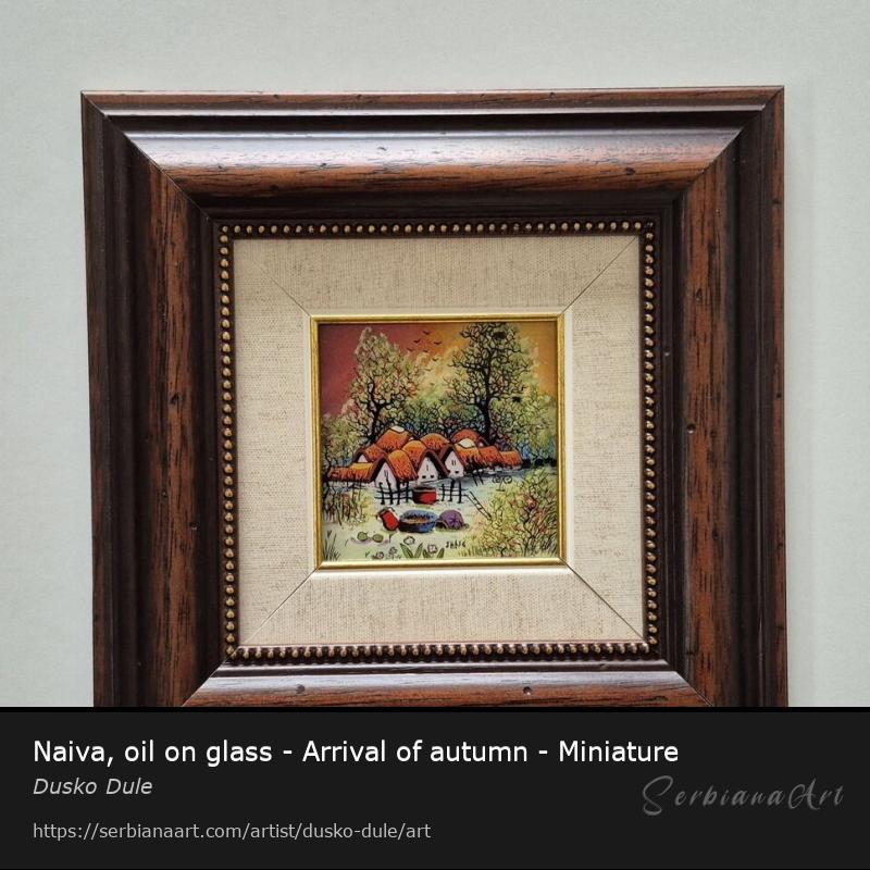 Naiva, ulje na staklu Dolazak jeseni. Prelepo umetnicko delo. Minijatura. Slika je uramljena u jako lep ram, dimenzije slike sa ramom 26 x 26. Privatna kolekcija.