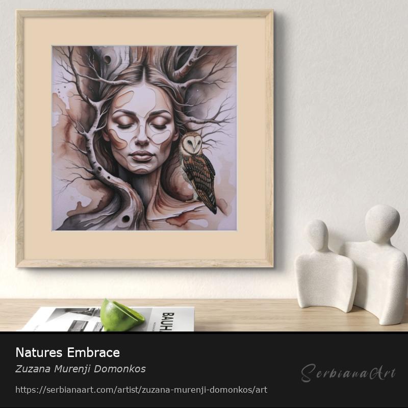 This artwork is a stunning visual representation of the connection between nature and humanity, as if the tree’s roots weave not only through the earth but also through our souls. The organic intertwining of the woman’s face and the tree branches clearly suggests that humans don’t just live in nature but are an inseparable part of it – even if we sometimes forget this truth. The owl, symbolizing wisdom and quiet vigilance, seems to silently say, "Pay attention, for nature is never silent." The soft tones of earthy colors convey a sense of peace and harmony that only nature can provide, while the intricate details tell a deeper story. The closed eyes emphasize the importance of inner journeys, reminding us that nature exists not only around us but within us. This artwork presents a world where the boundary between humans and nature dissolves, showing how all living beings are part of a greater, interconnected system. One glance at this piece is enough to realize that perhaps it’s not we who protect nature, but nature that sustains us. Every stroke, every detail, reminds us that nature’s wisdom is always with us – we just need to quiet ourselves to hear it.
