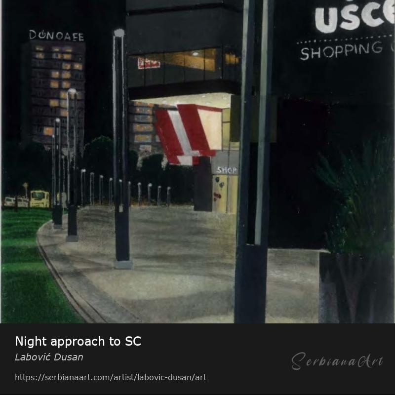 Prkazano šetalište pored tržnog centra noću , u daljini se vide soliteri sa reklamama , karakteristično svetlo na šetalištu I na objektima.