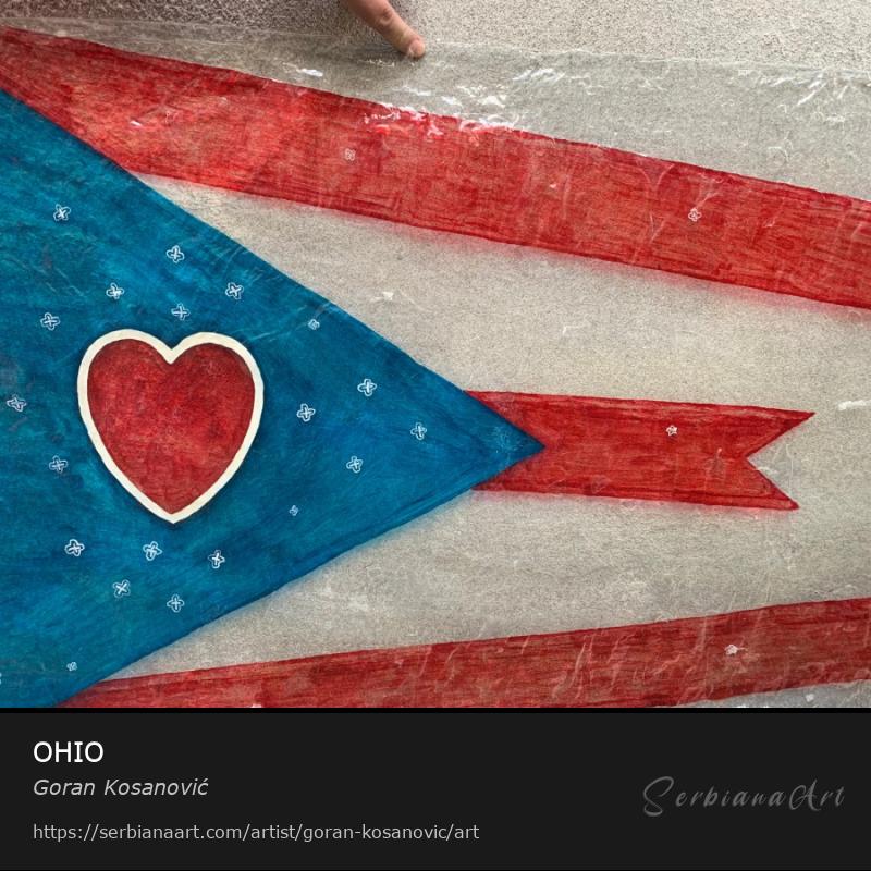 The artwork OHIO from the series "Flags" was exhibited at a solo exhibition in the Zvono gallery in Belgrade in 2012. The material it was made of is cellophane. Glass paints were used.
