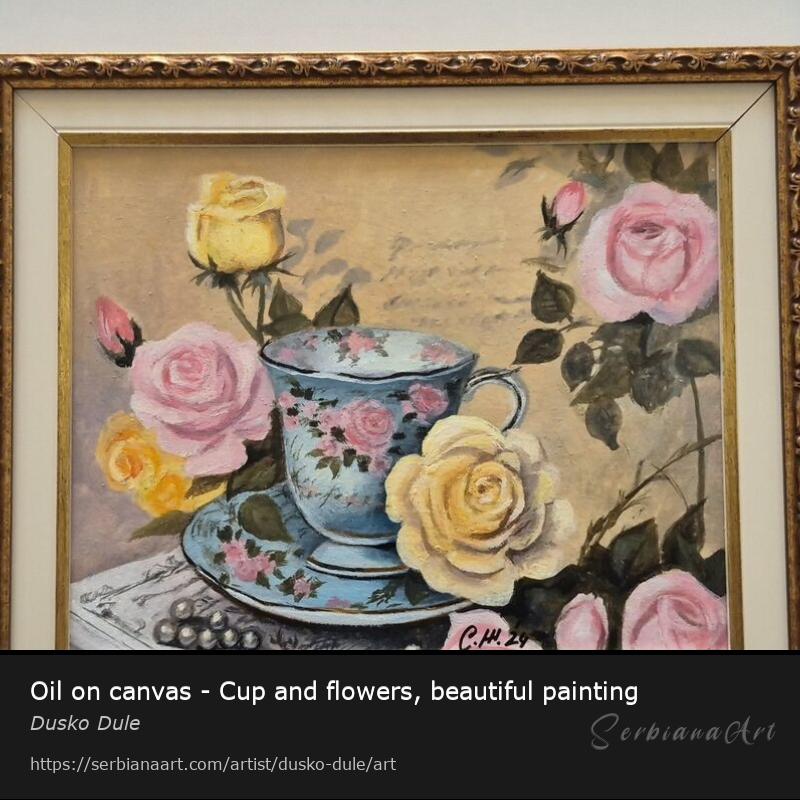 Oil on canvas - Cup and flowers, beautiful painting