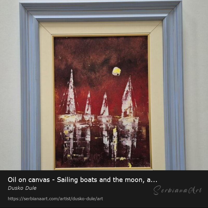 Oil on canvas - Sailing boats and the moon, a beautiful picture