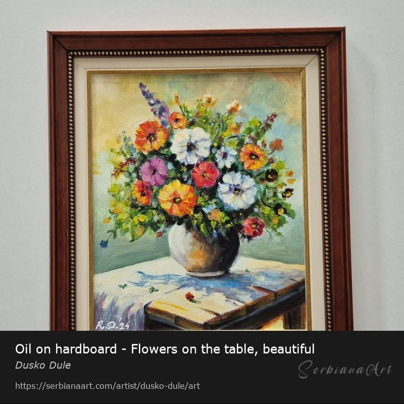 Oil on hardboard - Flowers on the table, beautiful