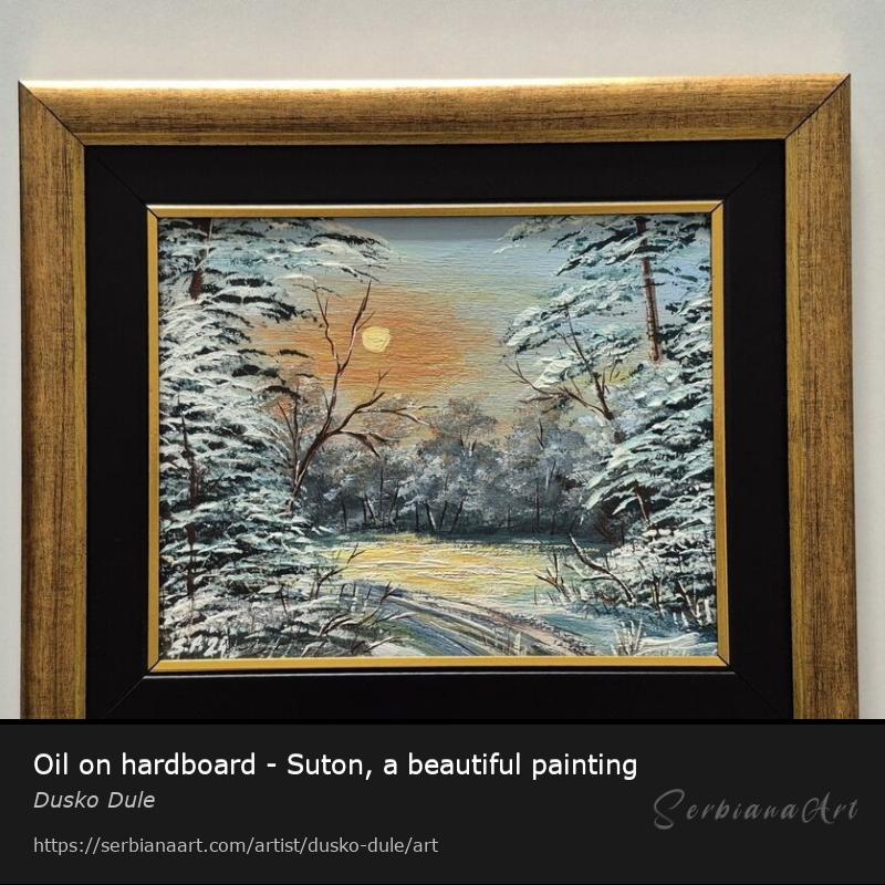 Ulje na lesonitu Suton, prelepo umetnicko delo. Slika je uramljena u jako lep ram, dimenzije slike sa ramom 42 x 37. Privatna kolekcija.