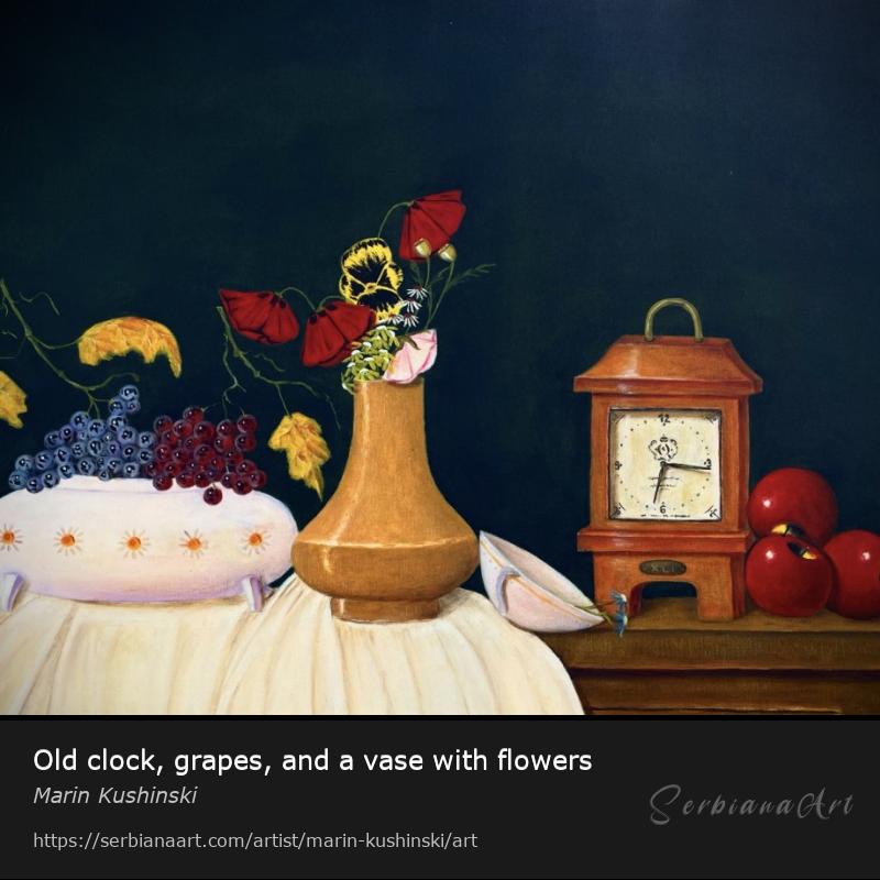The image features an old clock placed on a wooden surface, with details that reflect its age and character. The clock has an elegant design, with golden or bronze frames, and its dial is slightly faded, with classic numbers and hands slowly marking the passage of time. Next to the clock, there is a bunch of grapes, with juicy, dark berries that shine with a natural luster. The grapes are arranged on the table, possibly in a woven basket, with careful details emphasizing their freshness and richness. In the background, the light may be soft, creating a peaceful atmosphere that evokes past times and simple yet beautiful moments.