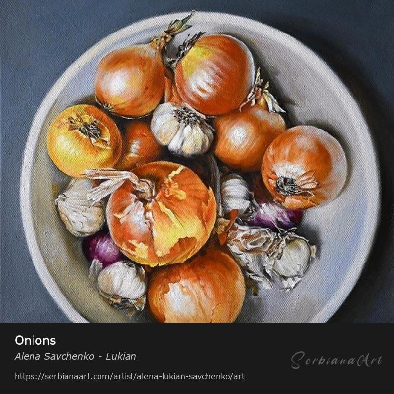 This artwork depicts a ripe onion, painted with oil on linen canvas. The realistic details and careful shading bring out the texture and natural beauty of this everyday object. The composition emphasizes the simplicity and elegance of nature, transforming an ordinary subject into a captivating piece of art.