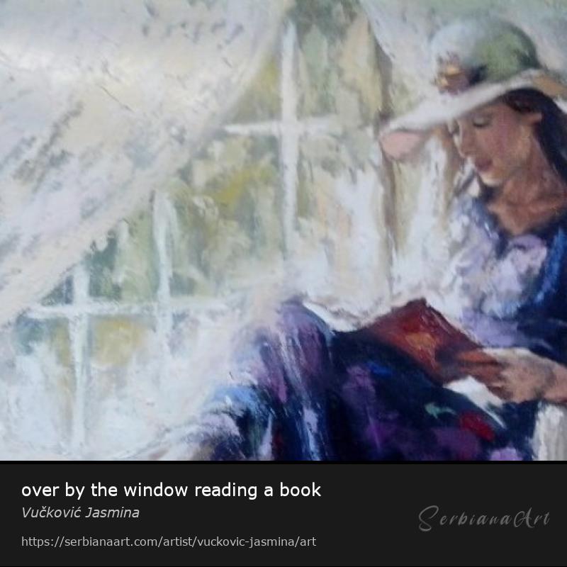 over by the window reading a book