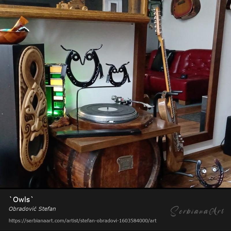 ``Owls`` sculpture two owls made of horseshoes and other metal parts that are painted with metal paint. An interested buyer can order a similar sculpture ``Owl`` since it was sold.Share and promote this artwork