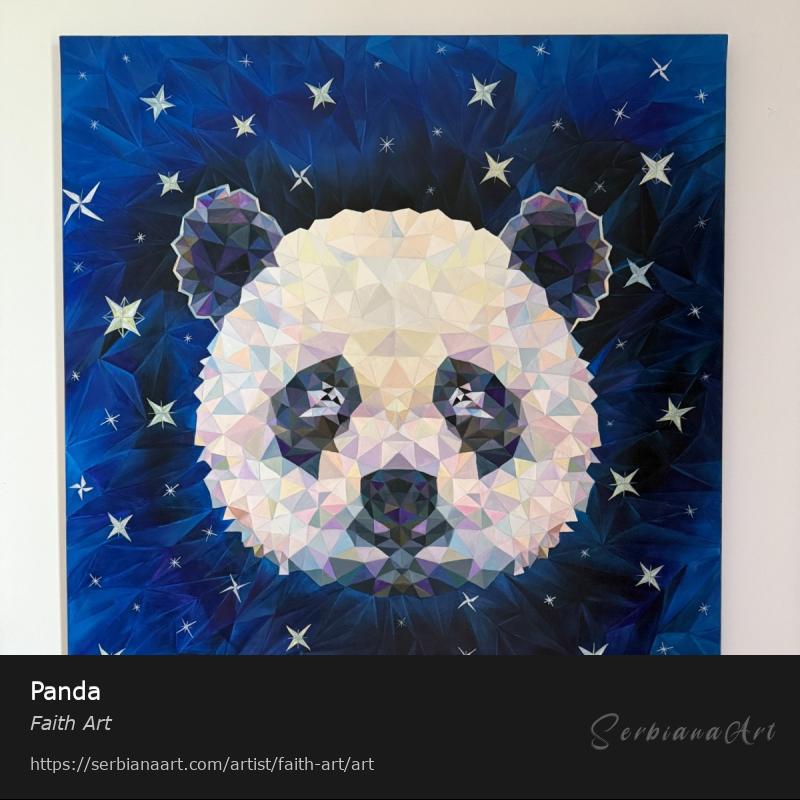 A unique piece of art that blends the gentleness of nature with the contemporary aesthetic of geometric expression. The panda’s head, rendered in a striking low poly style, radiates calmness, precision, and quiet strength. Sparkling stars surrounding it add a touch of magic and dreamlike quality, creating an atmosphere where serenity meets the cosmos.