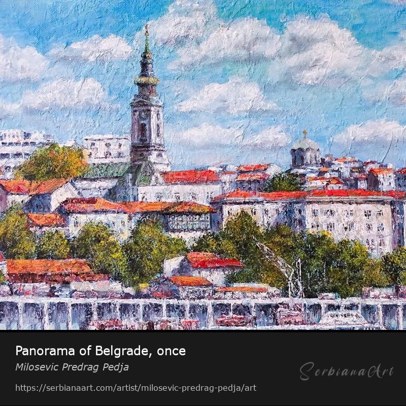 This painting, created with acrylic paints on canvas board, brings to life a nostalgic view of the Savski Pristanište in Belgrade and its surroundings from a time long past that has preserved its unique charm and atmosphere. The composition captures a fleeting moment between the past and the present, where, facing the horizon, the viewer can feel the calmness and silence of the river in contrast to the hustle and bustle of the city. In the foreground, we see the Savski Pristanište, with an anchored boat, creating an impression of otherworldly stillness. In the distance, in the background of the painting, is the panorama of Belgrade. The city's past is evident in the old buildings and chimneys rising toward the sky, while the landscape is bathed in light. Through a combination of rich colors and textures, the artist has succeeded in conveying the atmosphere of Belgrade "of old," while, through details of the water, the old boats, and the buildings, creating a deep emotional connection with times gone by.