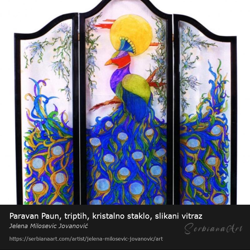 Paravan Paun, triptih, kristalno staklo, slikani vitraz, dimenzije 170cm x 145cmShare and promote this artwork