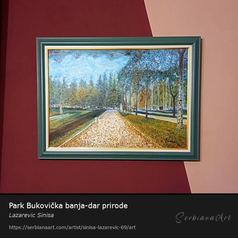 The painting "Park Bukovička banja" - the joy of nature" can be interpreted as a representation of the beauty of nature and its beneficial effect on the human mind and body. This painting can also represent the artist's enthusiasm for the natural world, and his desire to convey it to the audience through his work. Original picture with signature