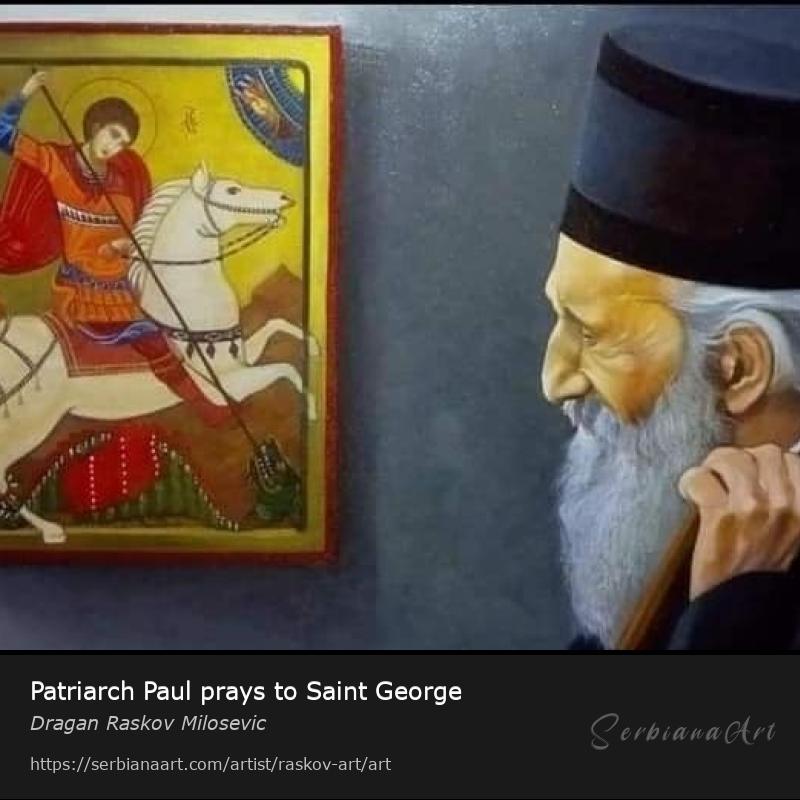 Realistic profile representation of Patriarch Paul in front of the icon of Saint George...