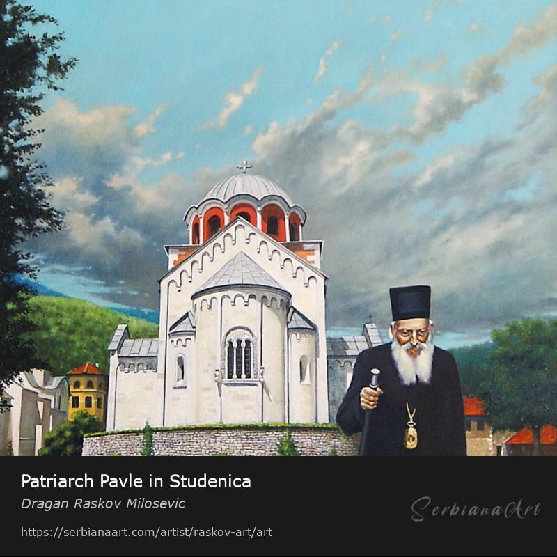 The composition represents the image of Patriarch Pavle in the gate of Studenica Monastery