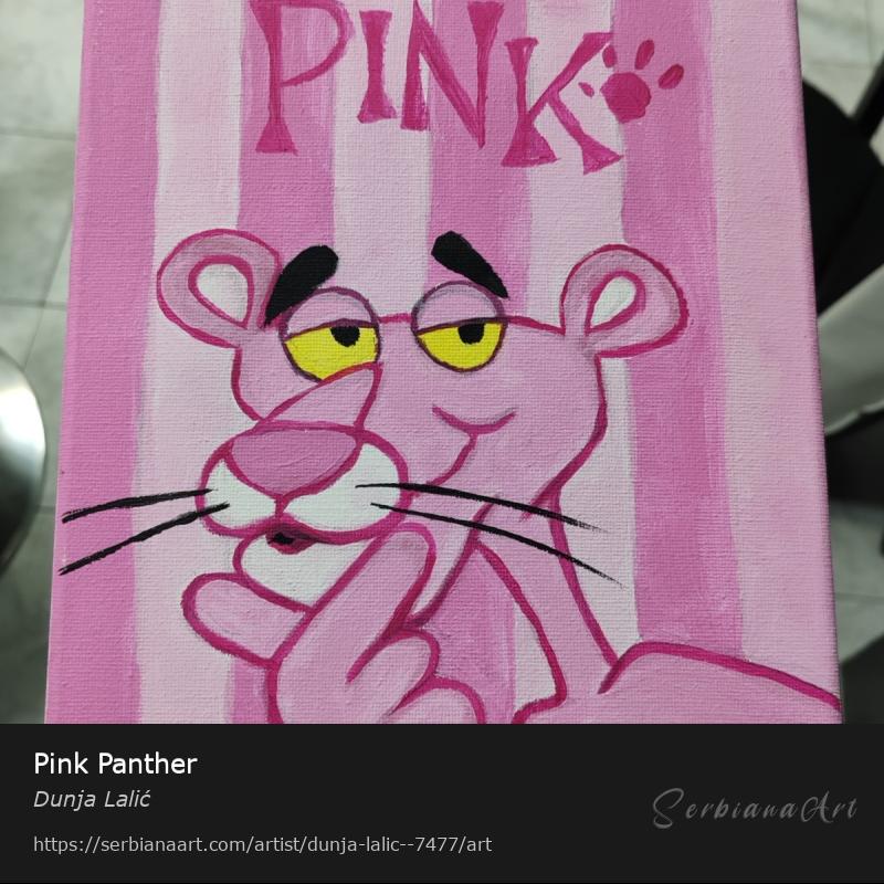 In this painting there is an artistic interpretation of the Pink Panther, painted on canvas. The main focus is the face of the Panther, which is executed with carefully selected details – his casual facial expression, raised eyebrow and characteristic smile convey a dose of charm and confidence. Signature of the artist dated 2024, which adds a personal touch to the work. The whole composition exudes serenity and nostalgic spirit.
