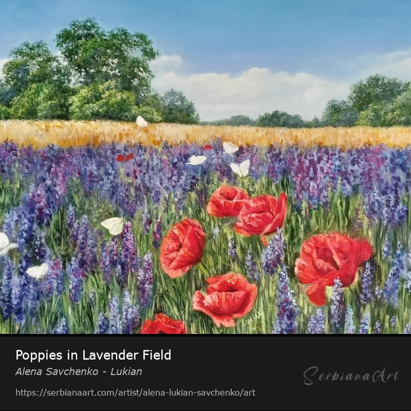 This original oil painting on canvas features vibrant red poppies blooming in a lavender field, blending realistic details with impressionistic brushwork to create a serene, romantic atmosphere.