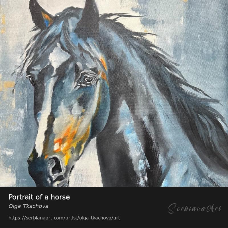 This masterful oil portrait captures the nobility and power of a black horse, its deep indigo hue standing out against a soft blue-and-white background. Each brushstroke brings realism and artistic expression to the painting, while the play of light and shadow highlights the perfectly sculpted muscles and lively, intelligent gaze of this majestic animal.