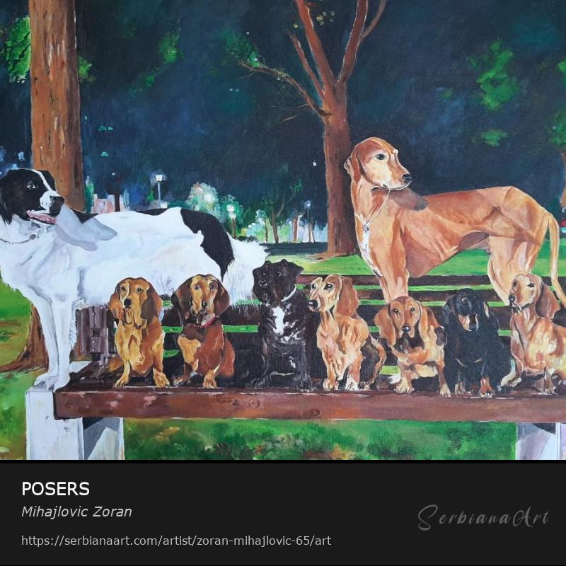Pets from my neighborhood. Walking through the park, I saw an incredible scene, my neighbors were lining up these wonderful dogs who were patiently posing. I transferred this impression to the canvas.