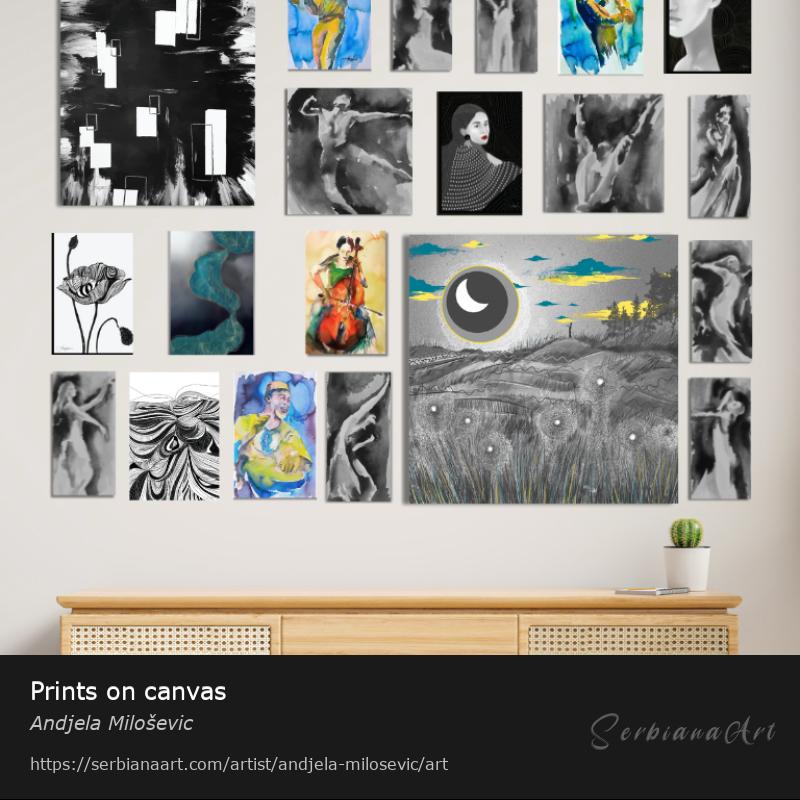 A collection of high quality prints - prints on canvas - with a decorated blind frame 2cm thick. Choose a picture from the display on the wall or contact me for more information. The pictures are from the collections of watercolors and washed ink that also exist in the original (watercolor or washed ink on paper