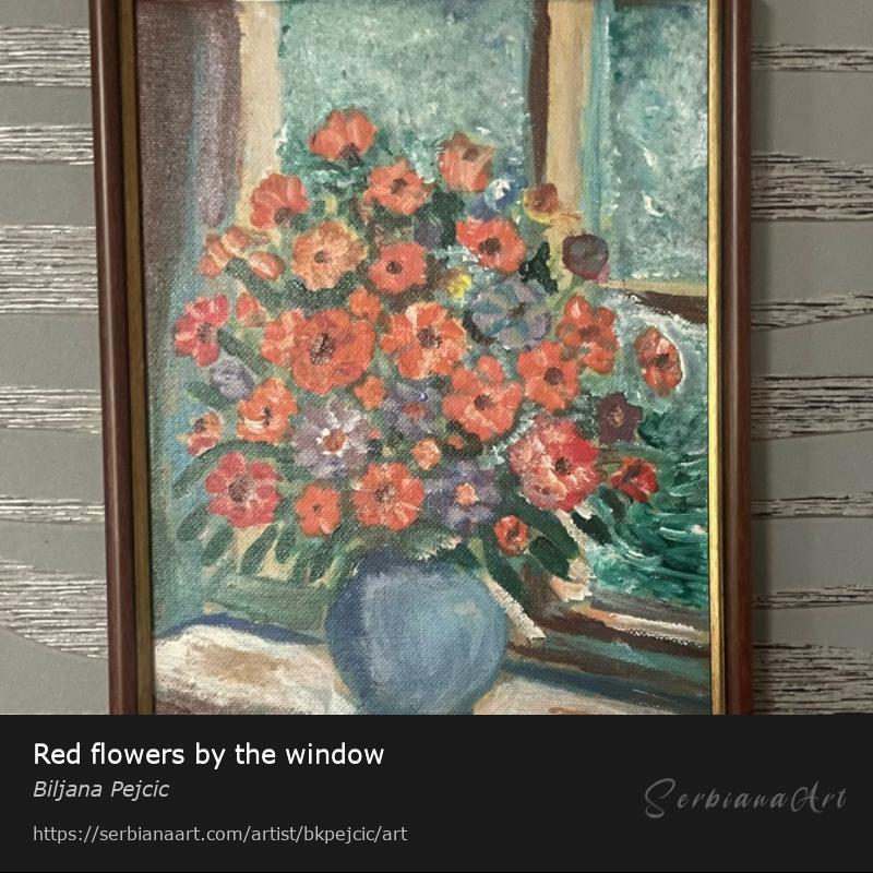 Red flowers in a vase by the window symbolize love, warmth and quiet anticipation.