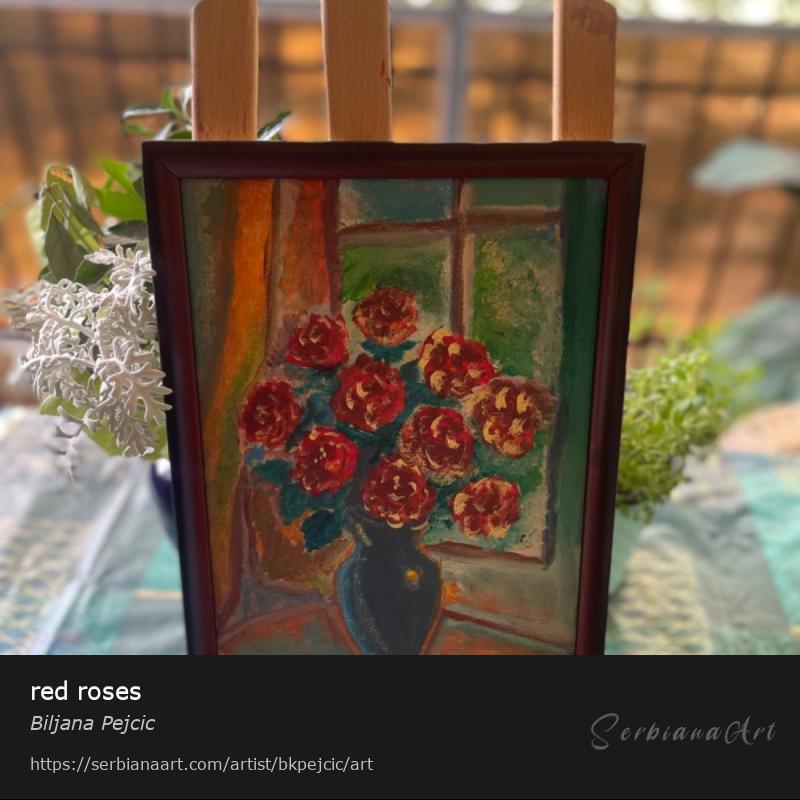 In The pictur Red roses in a vase by the window symbolize passionate love, longing and beauty that waits or passes .