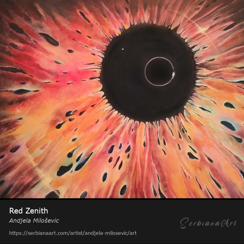 “Red Zenith” is a powerful swirl of fiery energies surrounding a dark, pulsating core. Seemingly on the verge of losing control, this celestial play is equal parts passion and destruction, spark of life and flame of death. Even at its peak vibrancy, the commanding stare of the core – is inescapable.