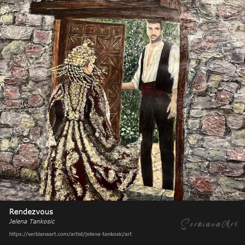 Artwork shows bride in traditional costume from old city of Prizren, (Kosovo). She wears antique headpiece made of golden coins and laces and handmade embroidered clothes that symbolise her ethnicity. Man also wears traditional serbian clothes. Painting also presents old architecture, gate made of natural stone and wood.Share and promote this artwork