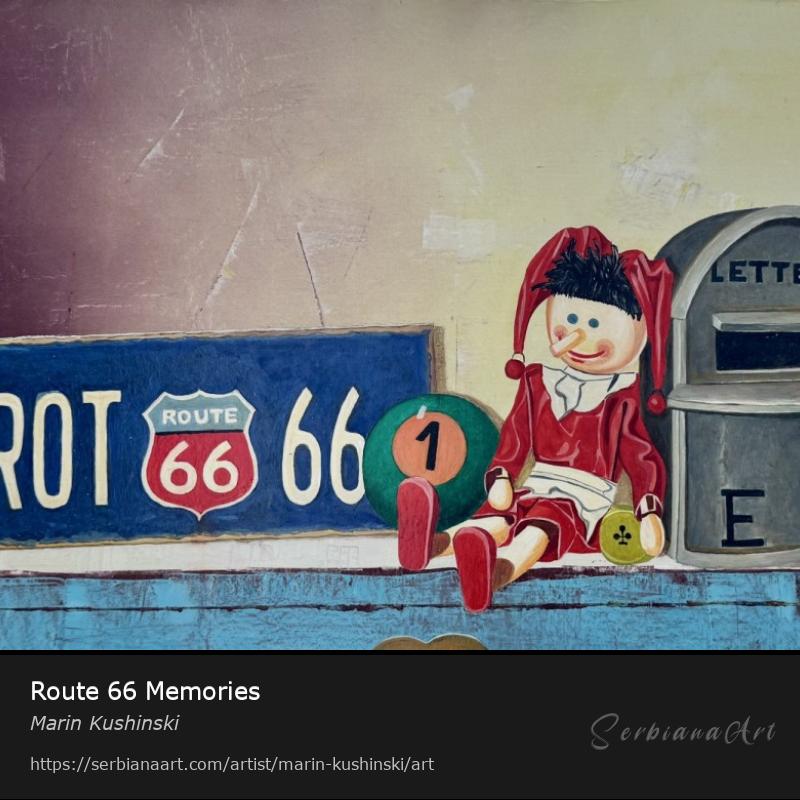 This oil painting on canvas, titled “Route 66 Memories,” combines vintage and playful elements in a nostalgic still life composition. The centerpiece is a blue “Route 66” sign, symbolizing the iconic American highway. Beside it is a cheerful jester doll in a red outfit, seated with a billiard ball numbered “1” and a card suit emblem. To the right, a vintage gray mailbox labeled “LETTERS” adds an old-world charm. The lower portion features a turquoise wooden surface with a heart-shaped keyhole, tying the elements together with a sense of sentimental journey and mystery. The warm and muted tones evoke themes of travel, whimsy, and personal stories.