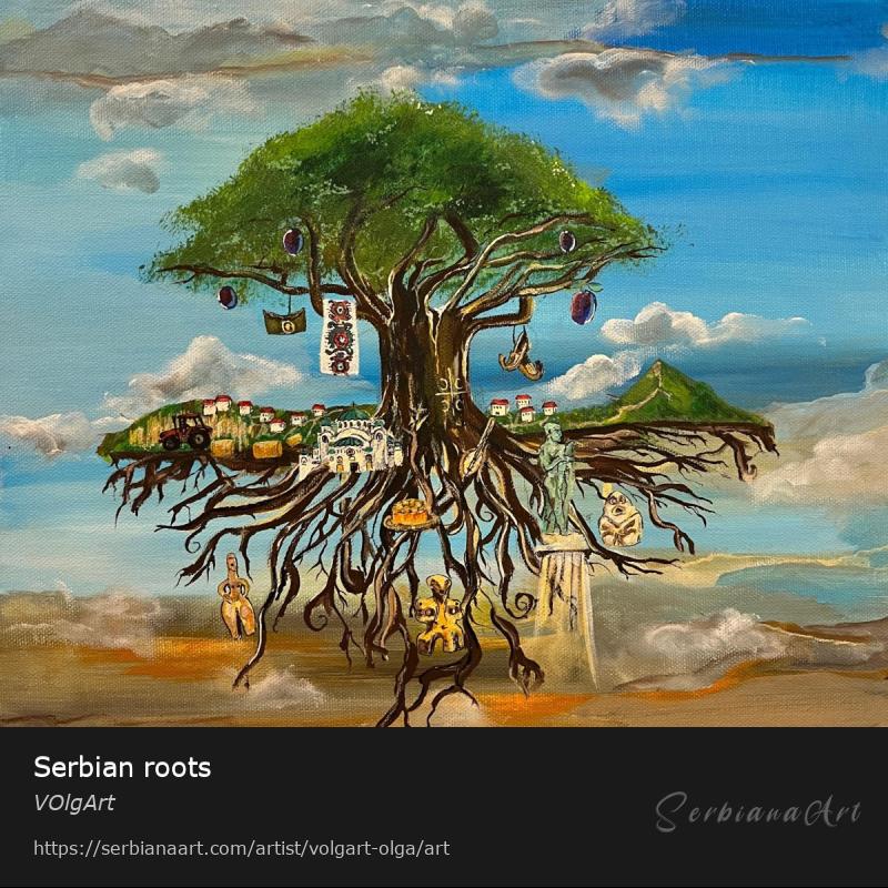 This is a picture of deep roots, literally and metaphorically.  A massive tree dominates the composition, with a canopy that spreads towards the sky, while its rooted fingers reach into the past, into tradition, into the foundations of a .  Parts of culture can be recognized in the canopy, while under the ground, in the labyrinth of roots, there are figures that bear witness to past times - the Vinča figurine, monumental monuments, holy temples.