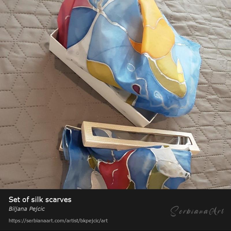 A set of 100% silk scarves, hand-painted and hand-trimmed. The smaller one is a detail for a purse, watch or on the hand, the larger one can be worn around the neck or on the head.