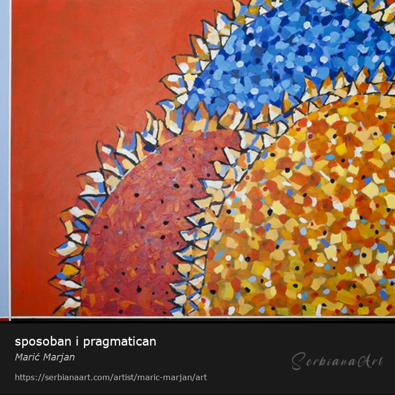 Platno je vecih dimenzija 200x150 cm. Ovo je prva slika i prekretnica u stvaralackom radu autpra, sam pocetak procesa traganja za hibridnim slikarstvom. spoj dva likovna stila. Znacajan komad iz koga je nastao ceo novi stil sa kockicama...Share and promote this artwork