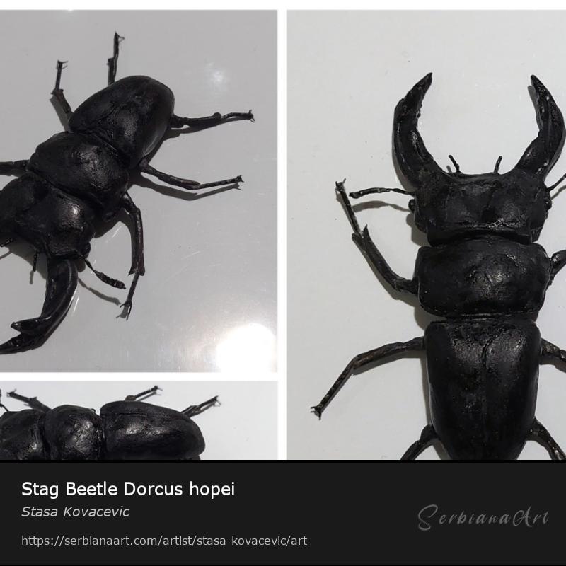 Hand-made Stag Beetle from modeling clay, and metal wire. The species name is Dorcus hopei, and its length is 8.5 cm, the same as the largest specimen measured in nature.
