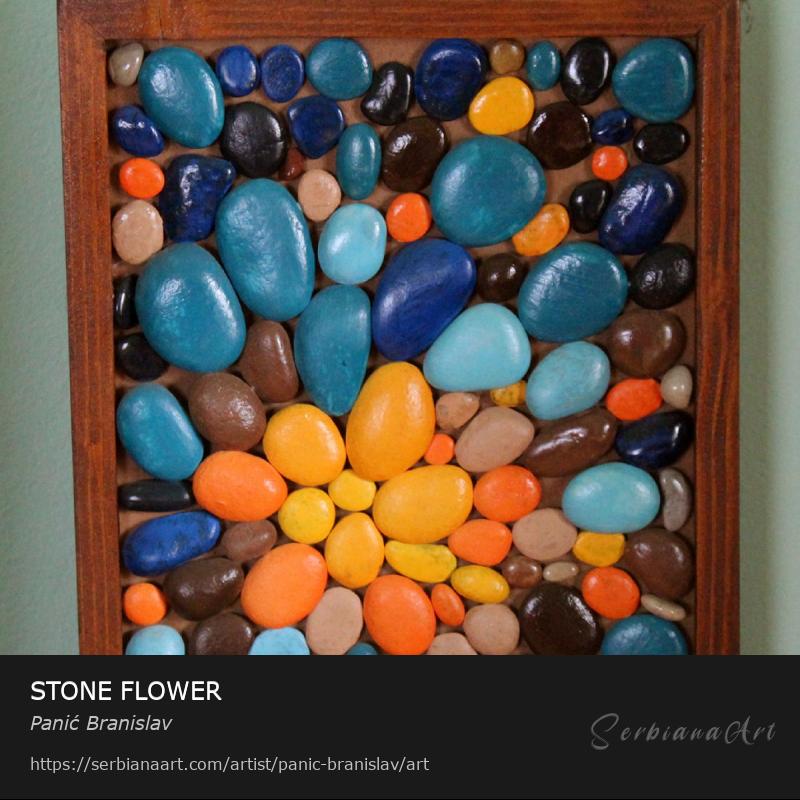 Stones are painted with acrylic colors, arranged and glued onto plywood.Share and promote this artwork