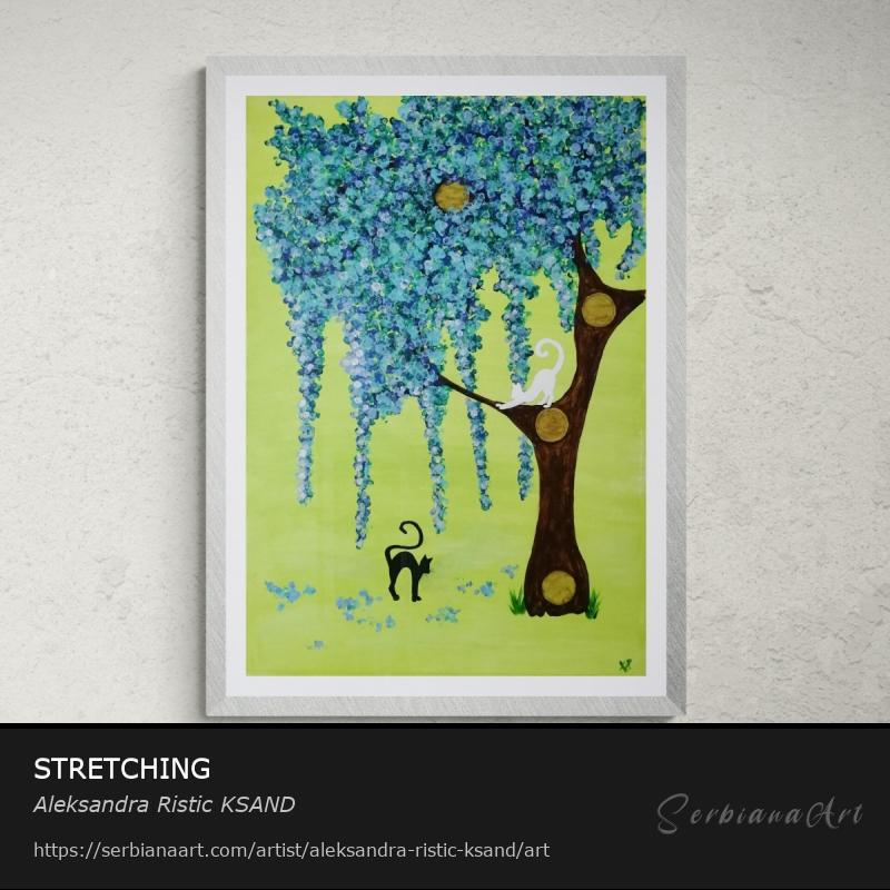 "Stretching" captures a serene moment of a white and black cat stretching outside its home, enjoying the natural surroundings. The cat’s stretching pose symbolizes the importance of flexibility, not just in the body, but in life itself. Just as stretching improves physical movement, it represents the power of adaptability, growth, and resilience in facing life’s challenges. This moment reminds us of the practice of yoga, which teaches us that, just like our bodies, our minds need to be flexible and open to change.