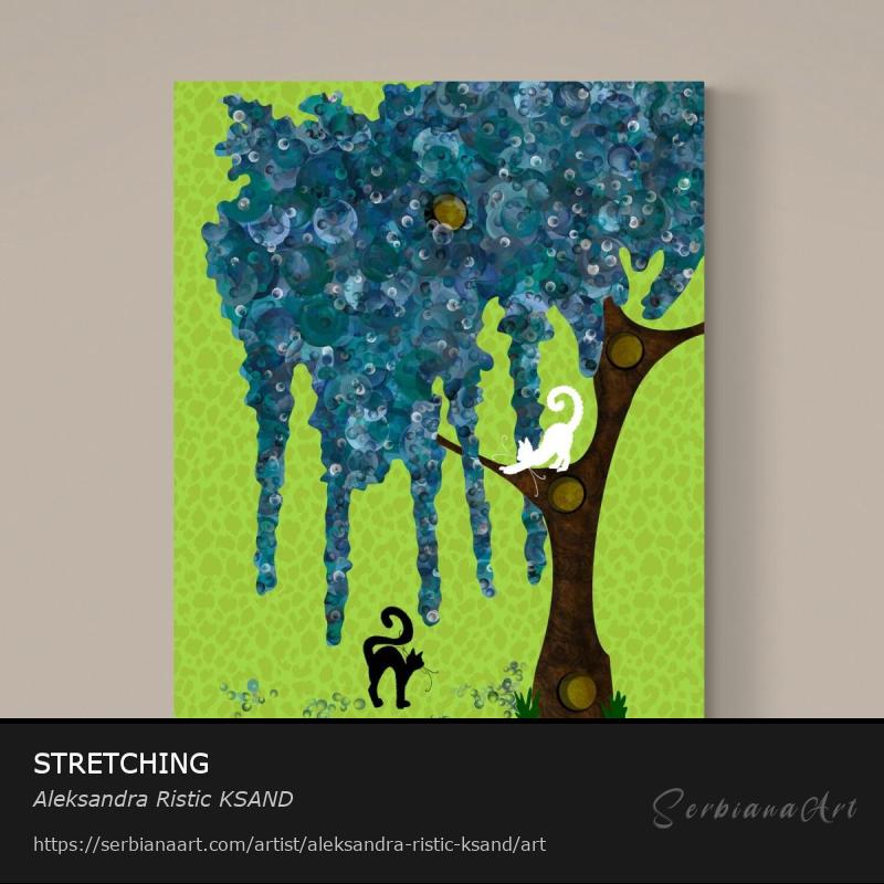 "Stretching" captures a serene moment of a white and black cat stretching outside its home, enjoying the natural surroundings. The cat’s stretching pose symbolizes the importance of flexibility, not just in the body, but in life itself. Just as stretching improves physical movement, it represents the power of adaptability, growth, and resilience in facing life’s challenges. This moment reminds us of the practice of yoga, which teaches us that, just like our bodies, our minds need to be flexible and open to change.