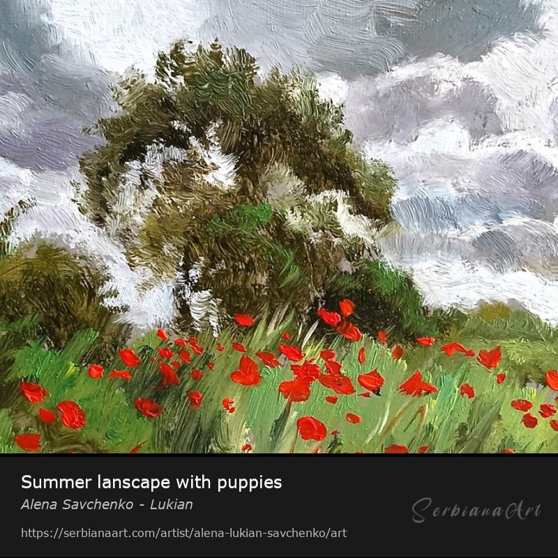 This expressive landscape captures a field of vibrant red poppies swaying under the weight of an overcast sky. Thick impasto brushstrokes bring texture and movement to the grass and trees, while the dramatic clouds hint at an approaching storm. The vivid contrast between the red flowers and the grey sky adds emotional tension and beauty to this impressionistic composition.