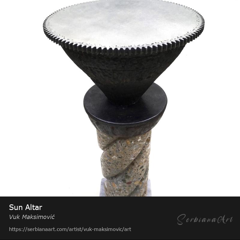 Sun Altar is made out of salvaged and reclaimed white marble, terazzo concrete, wood, iron and inox.