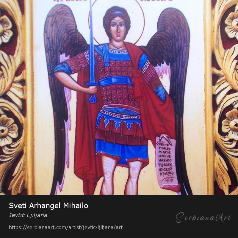SV. ARHANGEL MIHAILO sa pozlacenim rezbarenim ramom, dimenzije 40x60cm, jajcana tempera na lipovoj dasci, pozlata 22,5 karata.Share and promote this artwork