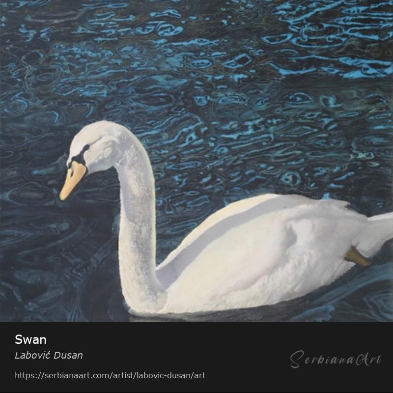 Predivna slika labuda koji pliva sam sredinom jezerceta dok se zraci sunca odbijaju o tamnu povrsinu vode I osvetljavajuci desnu polovinu labuda dok izrazene senke na levoj povrsinio docaravaju teksturu prikazane ptice. Uz kupljenu sliku isporucuje se gratis specijalna drvena kutija, namenjena za slučaj odlaganja slike, u kojoj je slika zaštićena od atmosferskih uticaja.