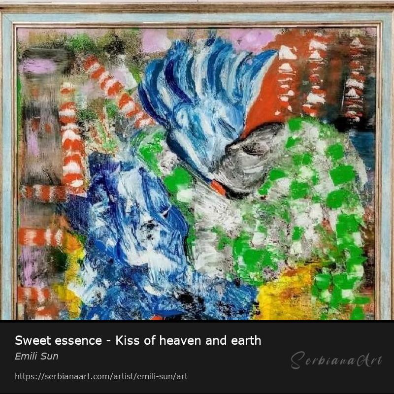 The painting Kiss of heaven and earth, abstraction, acrylic on canvas, 50x50cm without frame, with a frame it is slightly larger, has a high-quality frame, 2020, is part of the permanent exhibit of the VR exhibition "The Whispering of the constellations" on the Artsteps website