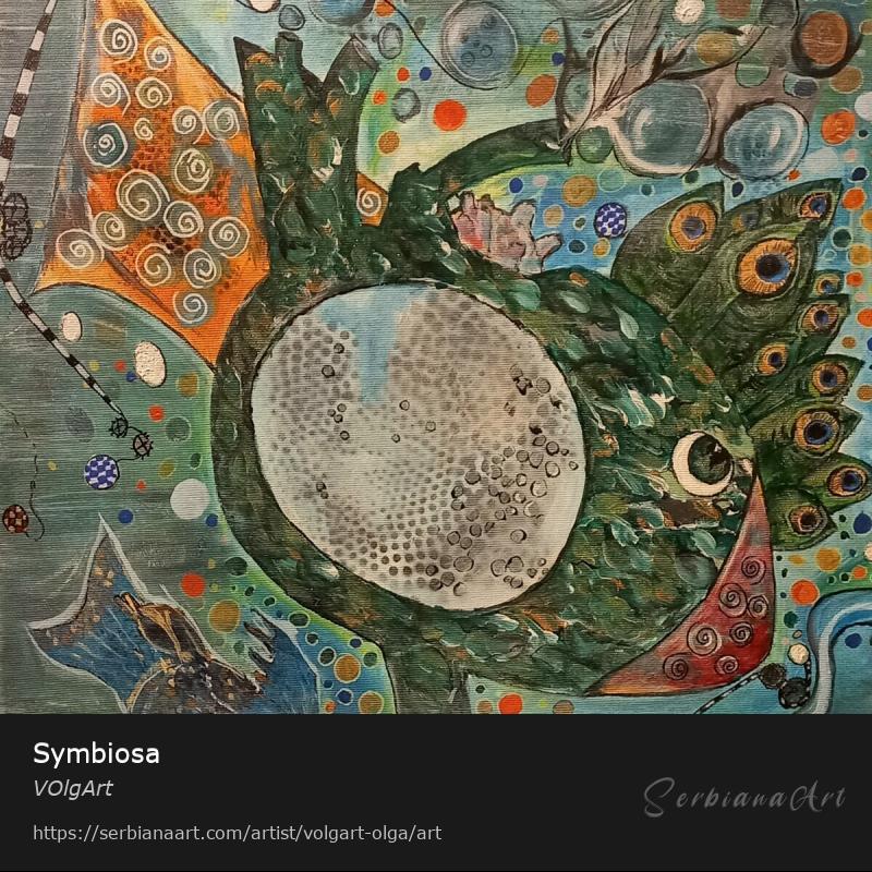 " Symbiosis " depicts the dance of life underwater, where the mother fish, immense in her love and wisdom, carries in her body the circle of life with a honeycomb that symbolizes wealth and abundance. Her crest, decorated with peacock feathers, reflects resourcefulness and beauty. The umbilical cord that connects the mother and the child represents a deep emotional connection and a continuous flow of vital energy.