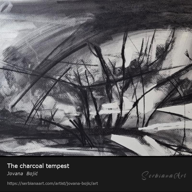 The seventh drawing "The charcoal tempest" of the series "Battle" - the drawings represent the battle between nature and the elements of the modern world, such as buildings, where nature is shown as a force which strives to regain its dominance amongst the world that man has made.
